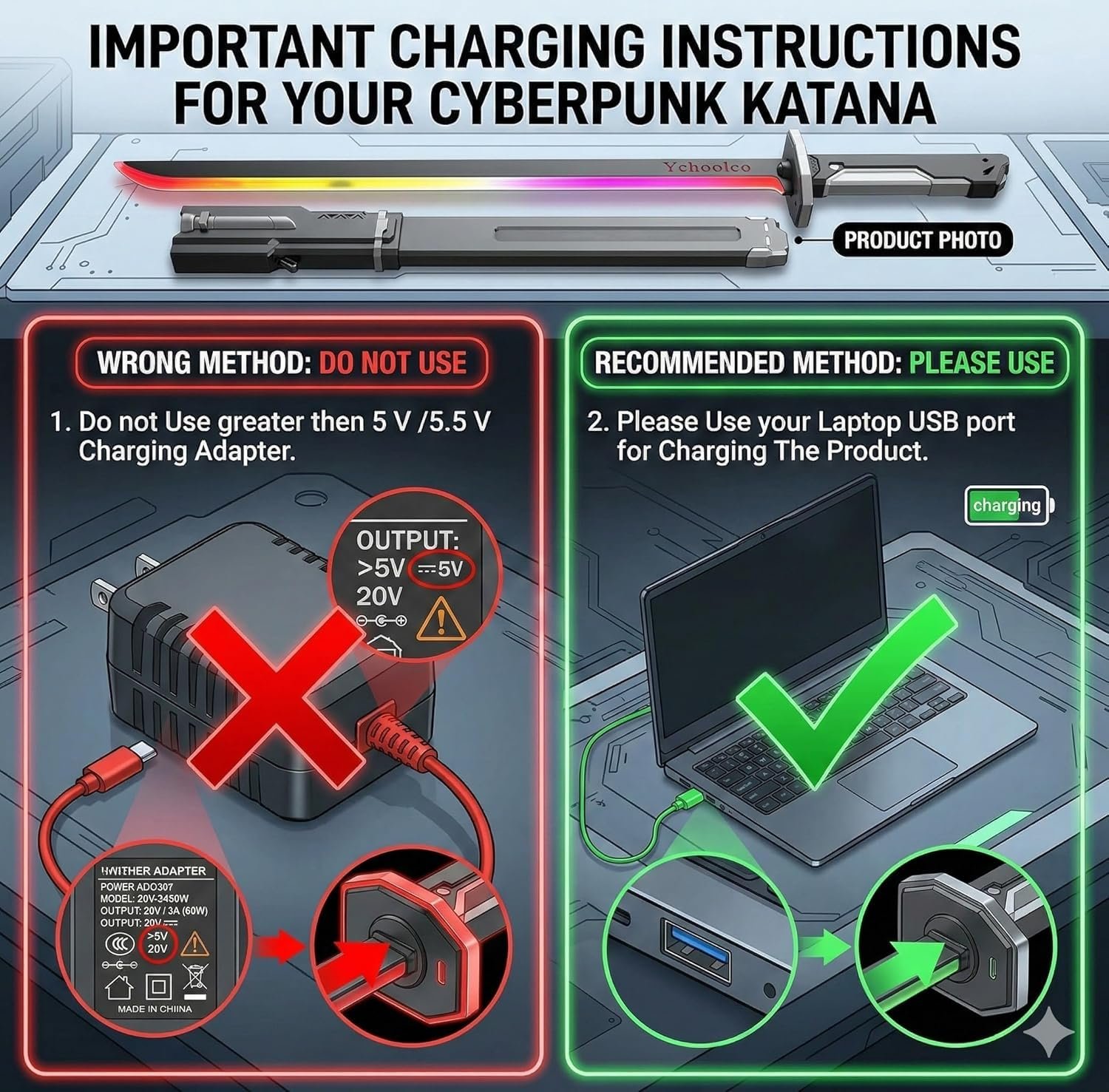 "DIMENSIONS: Large 80 cm length sword with 9.5 cm width provides an impressive presence for cosplay and entertainment activities. LED FEATURES: RGB multi-colour blade illuminates with vibrant transitions, creating stunning visual effects perfect for night-time play. SOUND SYSTEM: Motion-activated battle sound effects enhance the play experience, bringing realistic combat sounds to life. POWER SOURCE: Convenient USB rechargeable battery system ensures continuous play without frequent battery replacements. CONSTRUCTION: Crafted from durable plastic material with ergonomic handle design for comfortable grip during extended use sessions."